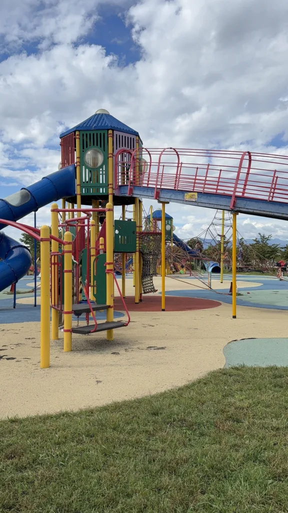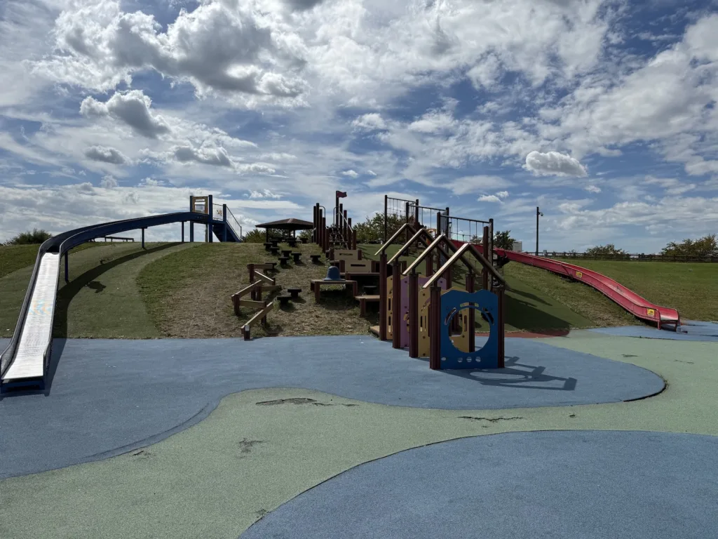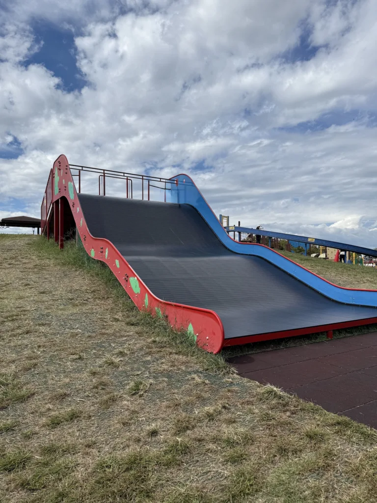 近くの斜面にはアスレチック遊具や短めのすべり台もあり、大型遊具がまだ難しい子どもでも楽しめるエリアがしっかり用意されています。さらに丘を登ると大きなすべり台も!