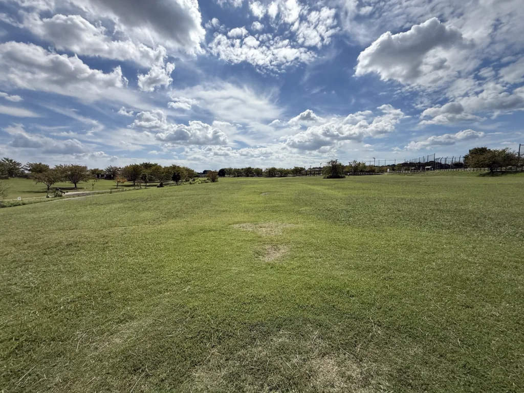遊具エリアの奥には、広大な芝生広場が広がります。