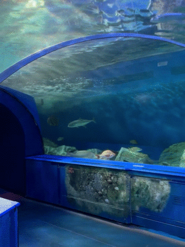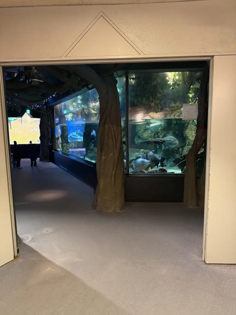 館内には、海の中を歩いているような感覚を味わえる「トンネル水槽」もあります。