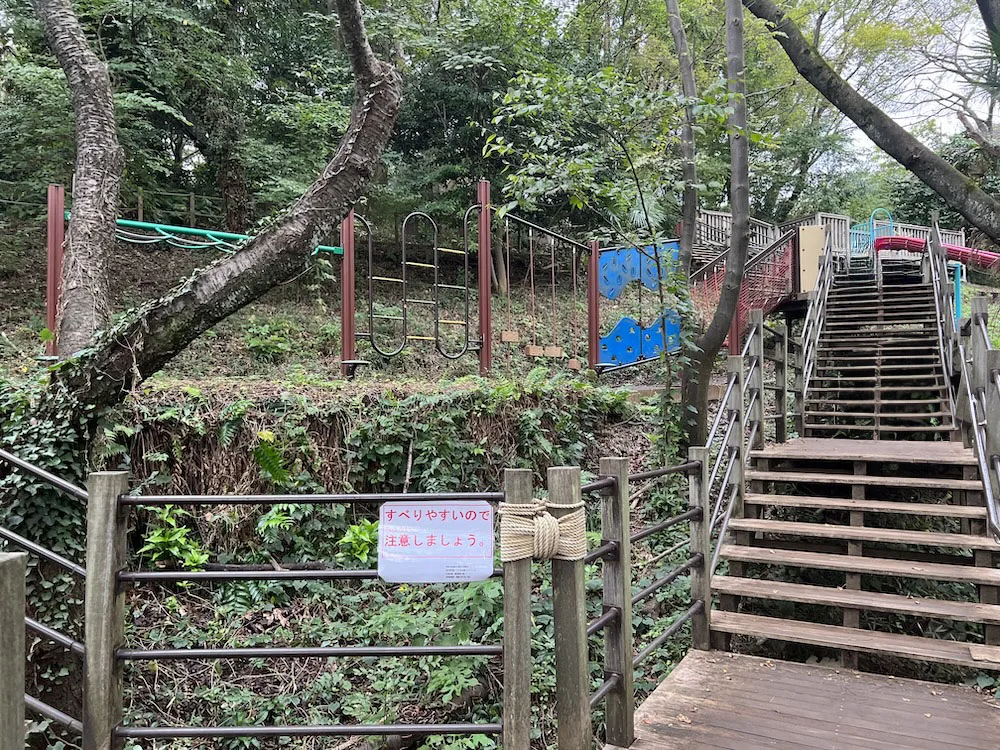 さらに、ロングすべり台の階段を登りきった先を奥へ進むと、ブランコなどがある小さな遊具エリアもあります。