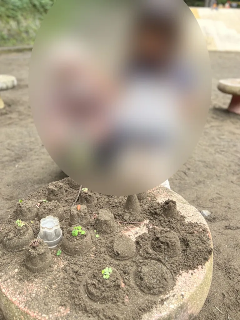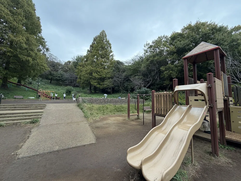 すべり台の下には広い広場があり、砂場遊びやボール遊びも楽しめます。